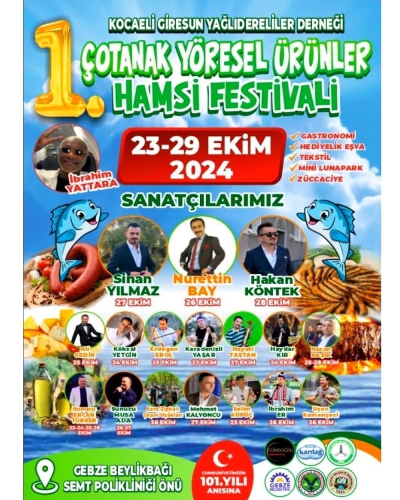 Bu yıl Kocaeli Giresun Yağlıdereliler Derneği tarafından ilk kez düzenlenen Çotanak Yöresel Ürünler ve Hamsi Festivali, büyük bir coşkuyla sürüyor. Festivalde 3000’den fazla ekmek arası hamsi dağıtıldı ve etkinliğe yoğun bir katılım sağlandı. Dernek Başkanı Engin Güngör ve yönetimi, festivalin yoğun temposuna rağmen katılımdan oldukça memnun olduklarını belirttiler.Festival, 4 gün boyunca devam edecek 29 Ekimde final.Birçok Karadeniz sanatçısı sahne alacağı bu etkinlik, yöresel kültürün tanıtılması ve toplulukların bir araya gelmesi açısından büyük bir önem taşıyor. Festivalde, Kelkit Vadisi’ni temsilen Nurettin Bay da yer aldı ve katılımcılara unutulmaz anlar yaşattı.. Etkinliğe katılan Trabzonspor’un eski yıldızı İbrahim Yattara, gençlerin yoğun ilgisiyle karşılaştı ve onlarla bol bol fotoğraf çektirdi. Yattara’nın katılımı, festivale ayrı bir renk kattı ve gençler için unutulmaz anılar oluşturdu. Dernek Başkanı Engin Güngör, “Bu yıl ilkini düzenlediğimiz Çotanak Yöresel Ürünler ve Hamsi Festivali’ne gösterilen yoğun ilgi bizleri çok mutlu etti. Giresunlu hemşehrilerimizle bir araya gelmek ve kültürümüzü yaşatmak için bu tür etkinlikleri sürdüreceğiz,” dedi.
